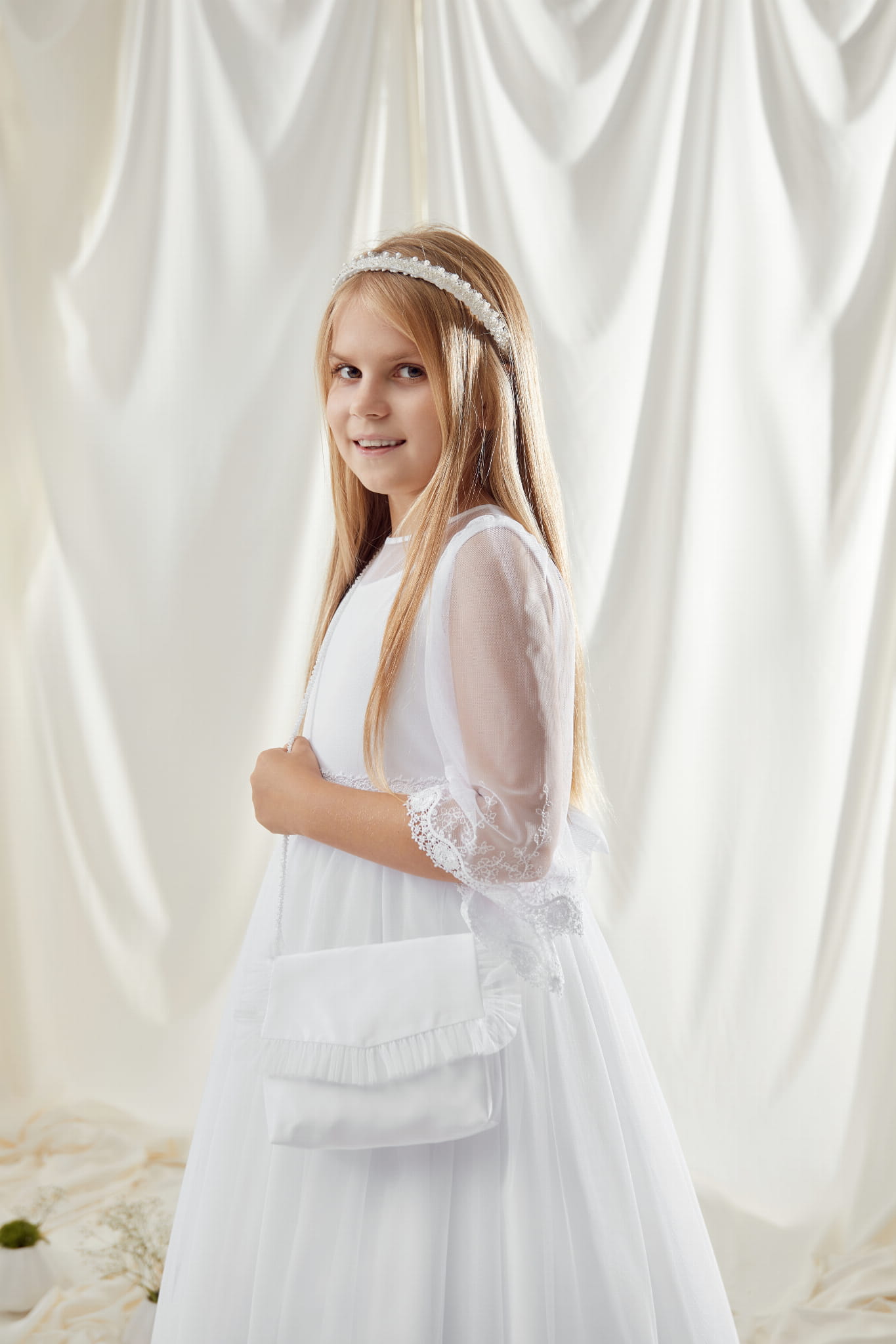 Przepiękna torebka wizytowa, okolicznościowa nadająca się jako dodatek; do Pierwszej Komunii Świętej, na wesele, urodziny. Wykonana z szczególną dbałością o każdy detal. Udekorowana tiulową falbanką i perełkowym paskiem. Doskonale pasująca do sukienek z kolekcji Special Moments.