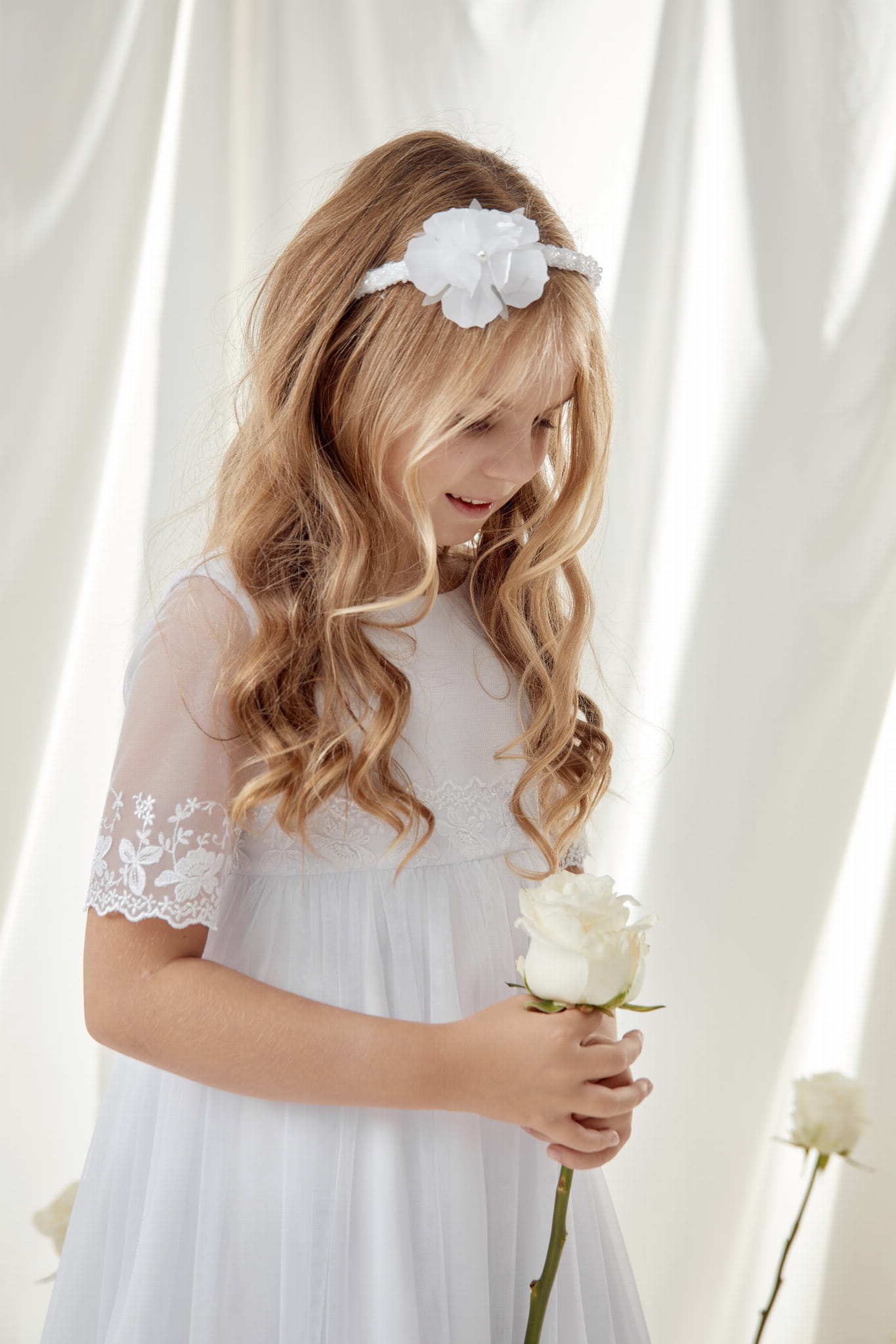 Biała opaska do Komunii przyozdobiona kwiatem z perełką