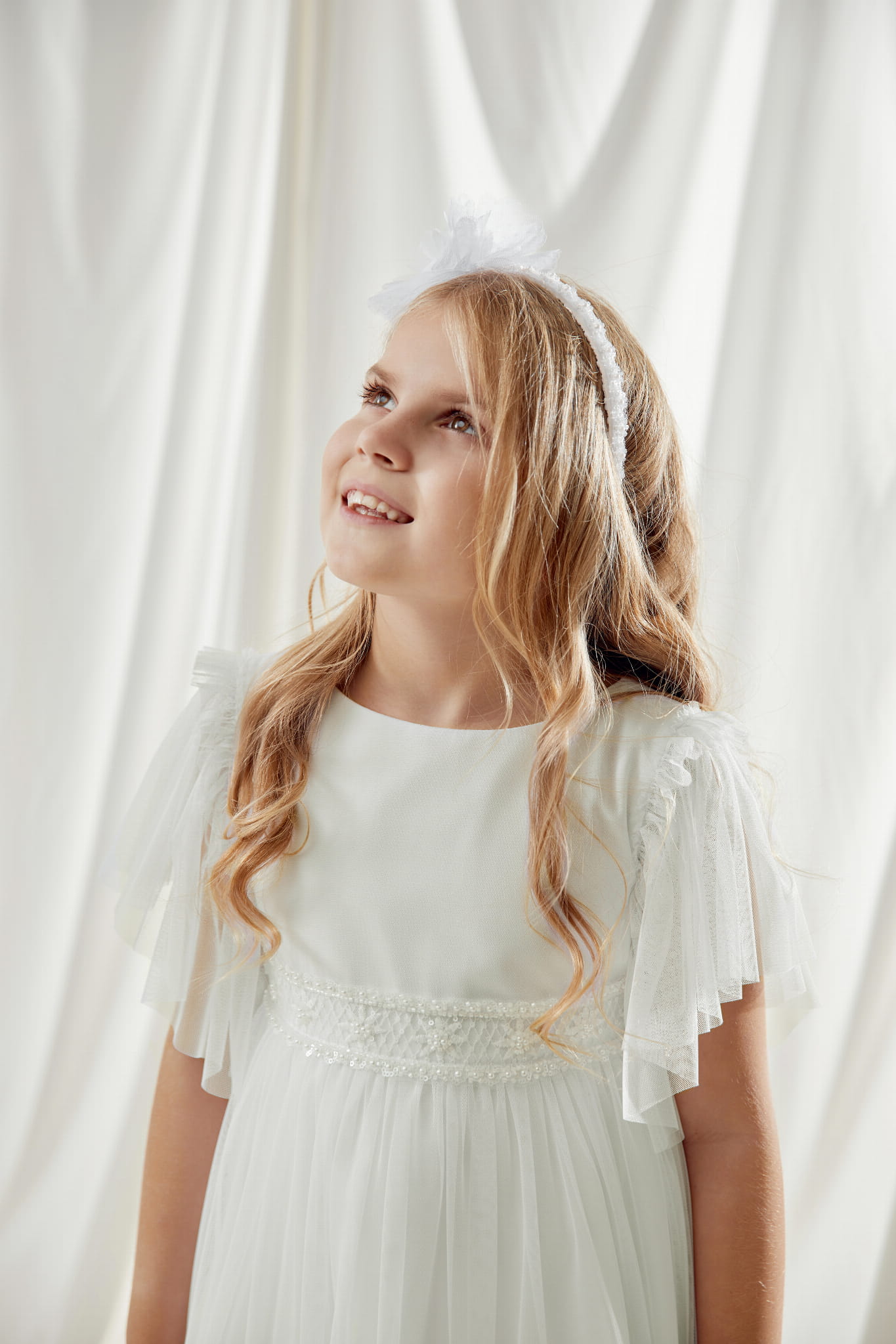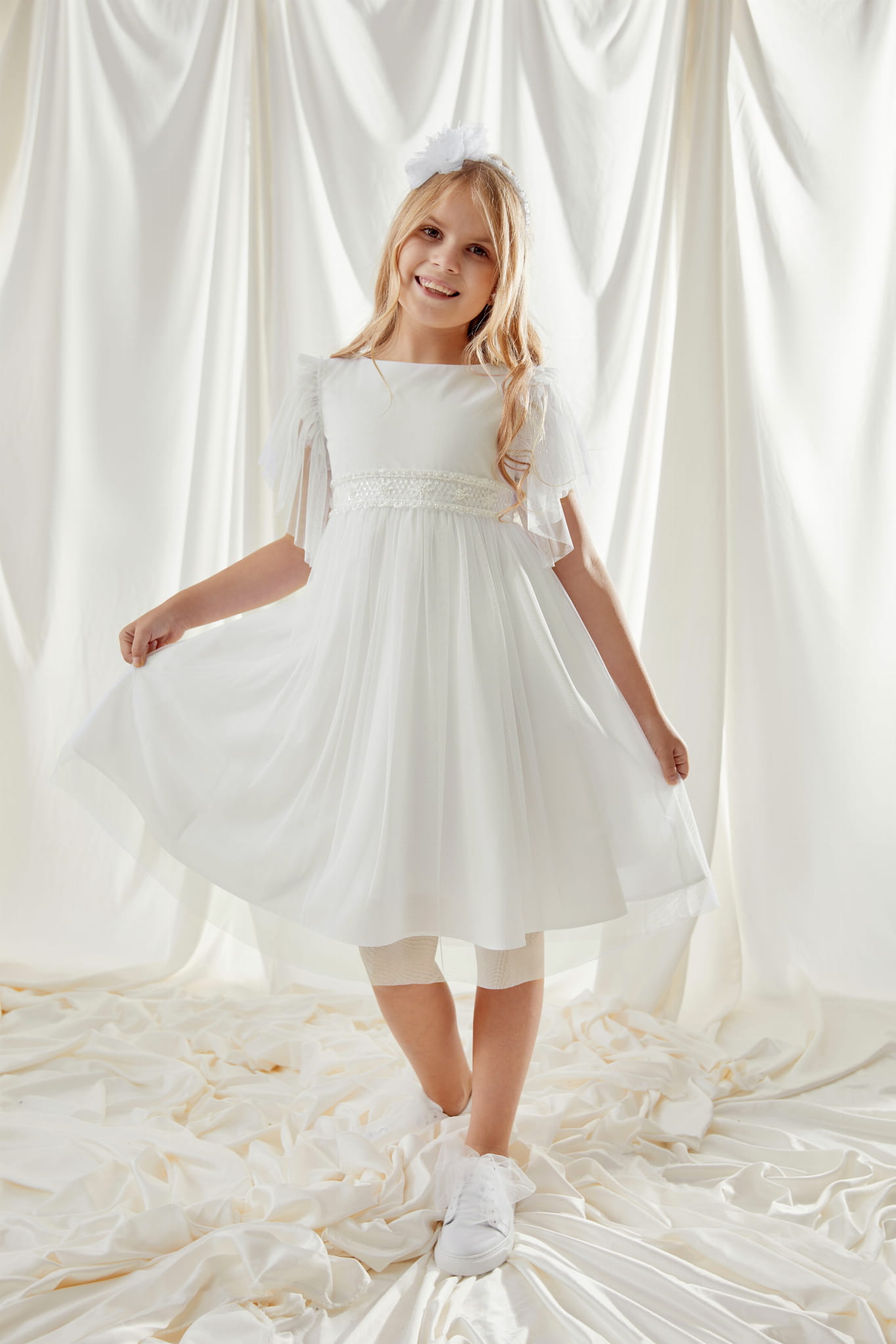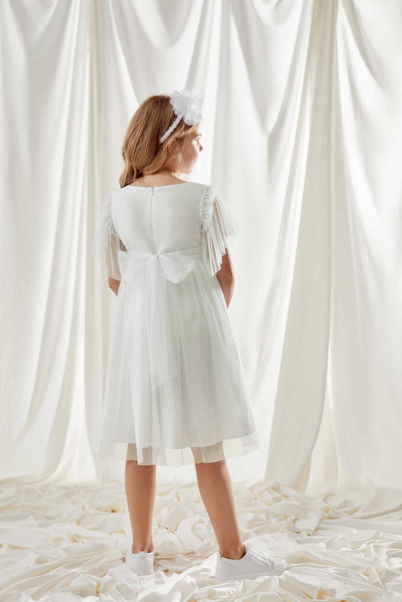 Przepiękna sukienka na uroczystość Pierwszej Komunii Świętej z podwyższonym stanem, fantazyjnymi rękawkami. Na karczku przyozdobiona biżuteryjną taśmą. Wykonana z miękkiego tiulu. Długość sięgająca do kolan. W tyle zapinana na suwak i przewiązana szarfą.