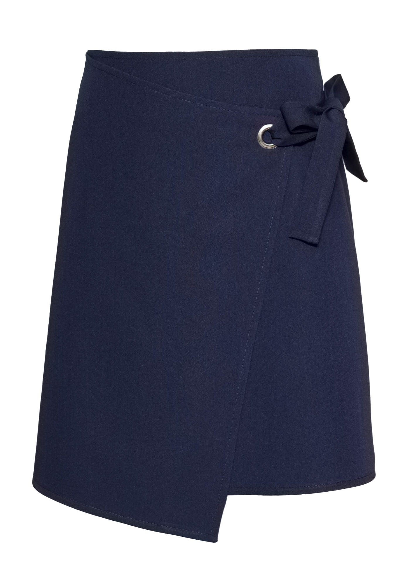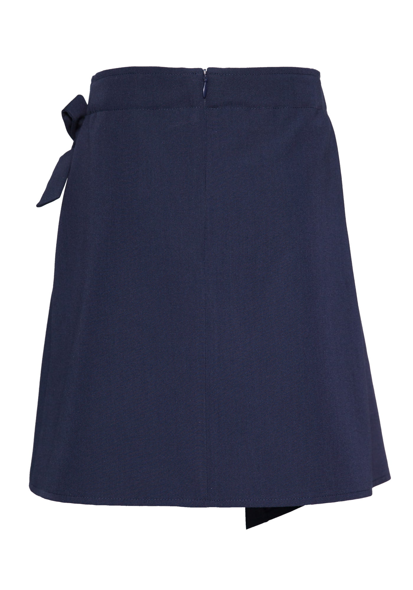 Kopertowa spódnica w granatowym kolorze. Na przodzie przyozdobiona wiązaniem. Idealna na uroczystości szkolne, urodziny i inne ważne momenty w życiu dziewczynki. Długość sięgająca do kolan.